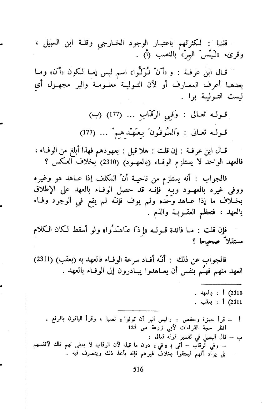 قلنا: لِكثرتهم باعتبار الوجود الخارجي وقلة ابن السبيل، وقرىء {لَيْسَ البِرَّ} بالنصب.
