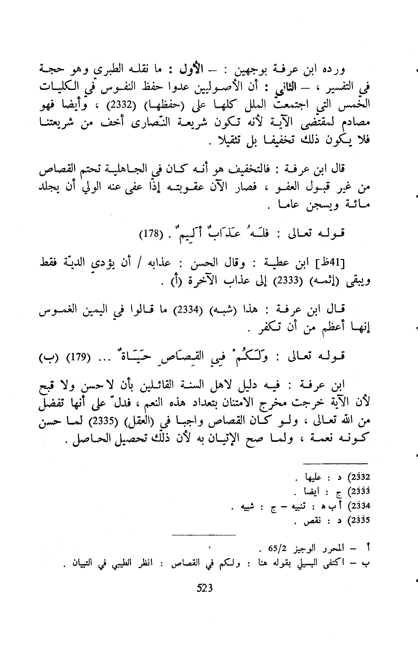 ابن عرفة: فيه دليل لاهل السنة القائلين بأن لا حسن ولا قبح لأن الآية خرجت مخرج الامتنان بتعداد هذه النعم، فدلّ على أنها تفضل من الله تعالى، ولو كان القصاص واجبا في (العقل) لما حسن كونه نعمة، ولما صح الإتيان به لأن ذلك تحصيل الحاصل.