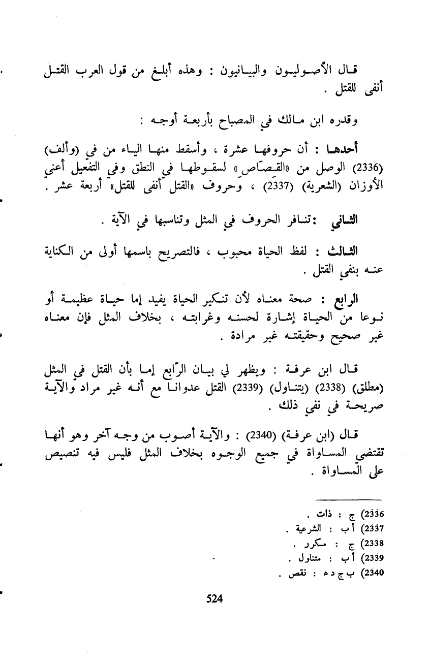 قال ابن عرفة: ويظهر لي بيان الرّابع إما بأن القتل في المثل (مطلق) (يتناول) القتل عدوانا مع أنه غير مراد والآية صريحة في نفي ذلك.