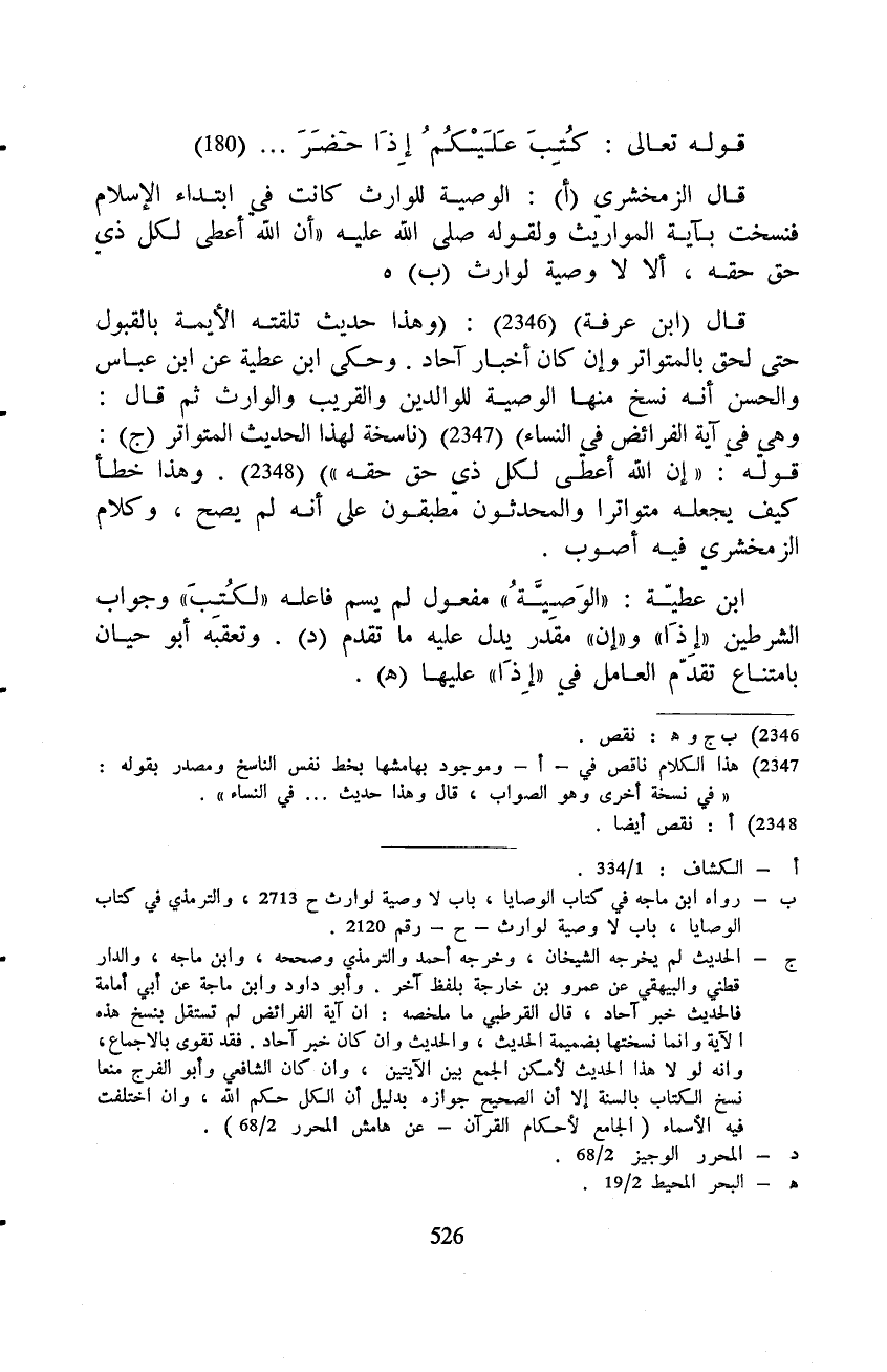 قال (ابن عرفة) : (وهذا حديث تلقته الأيمة بالقبول حتى لحق بالمتواتر وإن كان أخبار آحاد. وحكى ابن عطية عن ابن عباس والحسن أنه نسخ منها الوصية للوالدين والقريب والوارث ثم قال: وهي في آية الفرائض في النساء) (ناسخة لهذا الحديث المتواتر: قوله: «إن الله أعطى كل ذي حق حقه» ) . وهذا خطأ كيف يجعله متواترا والمحدثون مطبقون على أنه لم يصح، وكلام الزمخشري فيه أصوب.