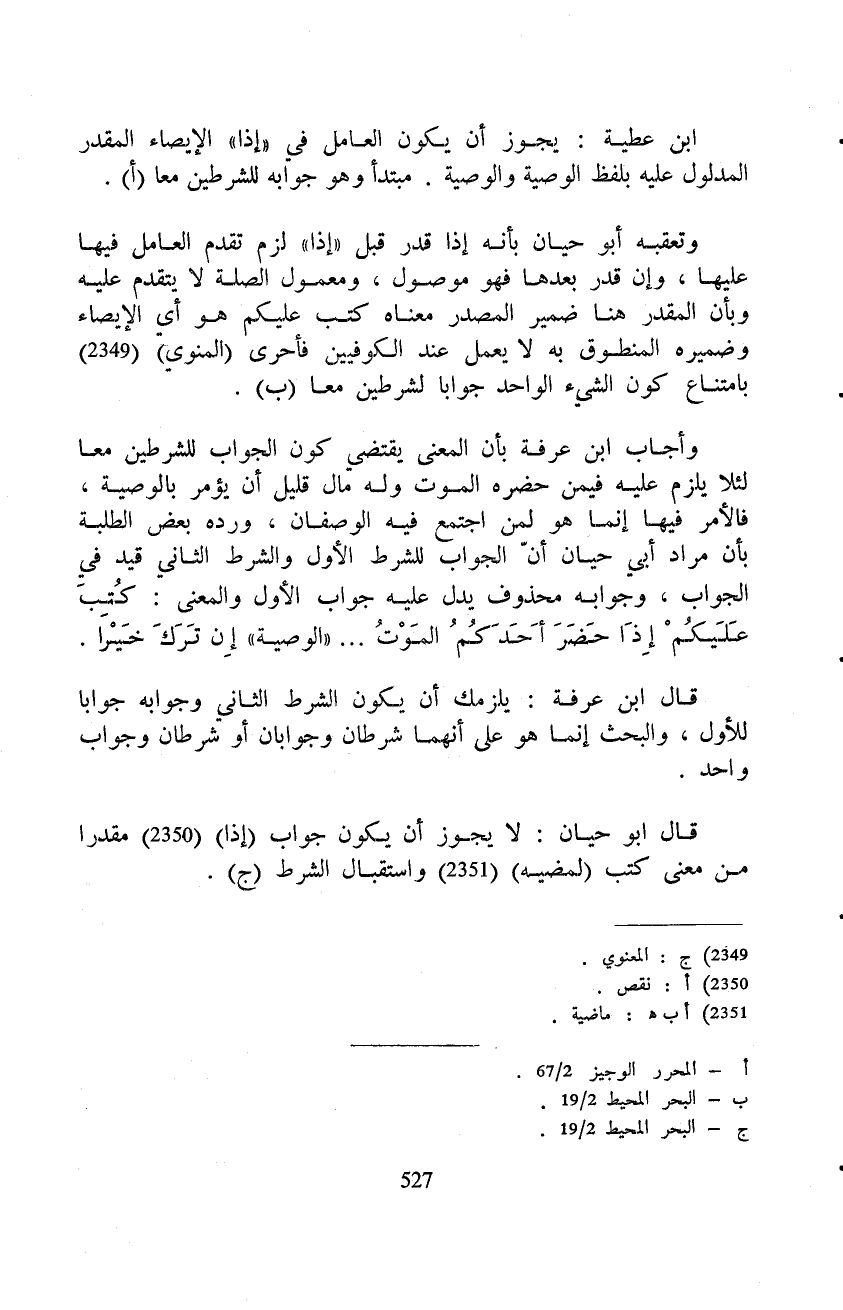 وأجاب ابن عرفة بأن المعنى يقتضي كون الجواب للشرطين معا لئلا يلزم عليه فيمن حضره الموت وله مال قليل أن يؤمر بالوصية، فالأمر فيها إنما هو لمن اجتمع فيه الوصفان، ورده بعض الطلبة بأن مراد أبي حيان أنّ الجواب للشرط الأول والشرط الثاني قيد في الجواب، وجوابه محذوف يدل عليه جواب الأول والمعنى: كُتِبَ عَلَيْكُمْ إِذَا حَضَرَ أَحَدَكُمُ الموت ... «الوصية» إِن تَرَكَ خَيْرا.