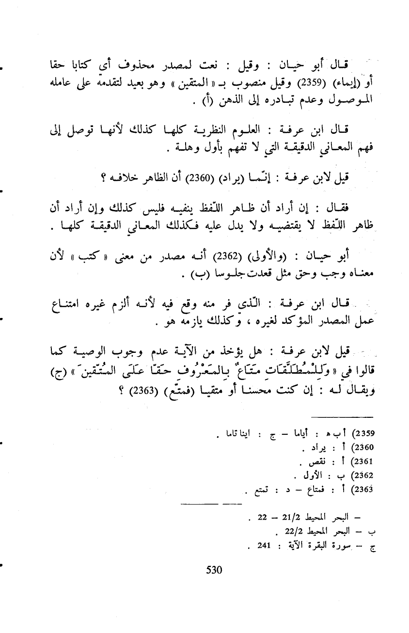قيل لابن عرفة: هل يؤخذ من الآية عدم وجوب الوصية كما قالوا في {وَلِلْمُطَلَّقَاتِ مَتَاعٌ بالمعروف حَقّاً عَلَى المتقين} ويقال له: إن كنت محسنا أو متقيا (فمتّع) ؟