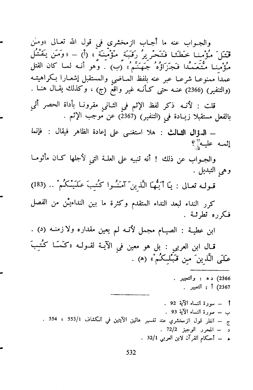 والجواب عنه ما أجاب الزمخشري في قوله الله تعالى {وَمَن قَتَلَ مُؤْمِناً خَطَئاً فَتَحْرِيرُ رَقَبَةٍ مُّؤْمِنَةٍ} {وَمَن يَقْتُلْ مُؤْمِناً مُّتَعَمِّداً فَجَزَآؤُهُ جَهَنَّمُ} وهو أنه لما كان القتل عمدا ممنوعا شرعا عبر عنه بلفظ الماضي والمستقبل إشعارا بكراهيته (والتنفير) عنه حتى كأنه غير واقع، وكذلك يقال هنا.