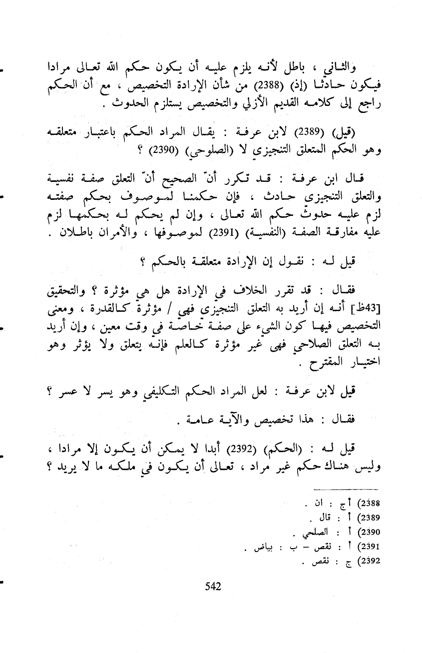 قال ابن عرفة: قد تكرر أنّ الصحيح أنّ التعلق صفة نفسية والتعلق التنجيزي حادث، فإن حكمنا لموصوف بحكم صفته لزم عليه حدوث حكم الله تعالى، وإن لم يحكم له بحكمها لزم عليه مفارقة الصفة (النفسية) لموصوفها، والأمران باطلان.