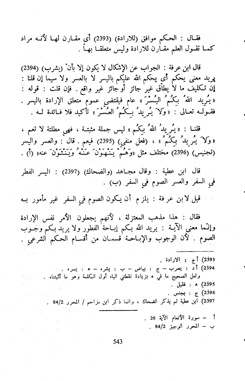 قال ابن عرفة: الجواب عن الإشكال لا يكون إلا بأنّ (يشرب) يريد معنى يحكم أي يحكم الله عليكم باليسر لا بالعسر ولا سيما إن قلنا: إن تكليف ما لا يطاق غير جائز أو جائز غير واقع. فإن قلت: قوله {يُرِيدُ الله بِكُمُ اليسر} عام فيقتضي عموم متعلق الإرادة باليسر. فقوله تعالى: {وَلاَ يُرِيدُ بِكُمُ العسر} تأكيد فلا فائدة له.