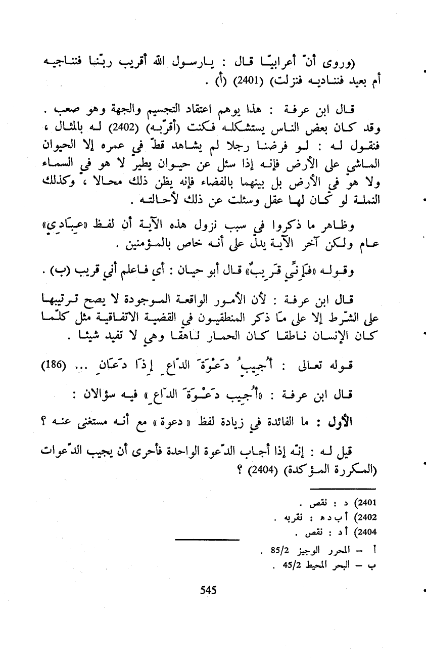 (وروى أنّ أعرابيّا قال: يارسول الله أقريب ربّنا فنناجيه أم بعيد فنناديه فنزلت) .