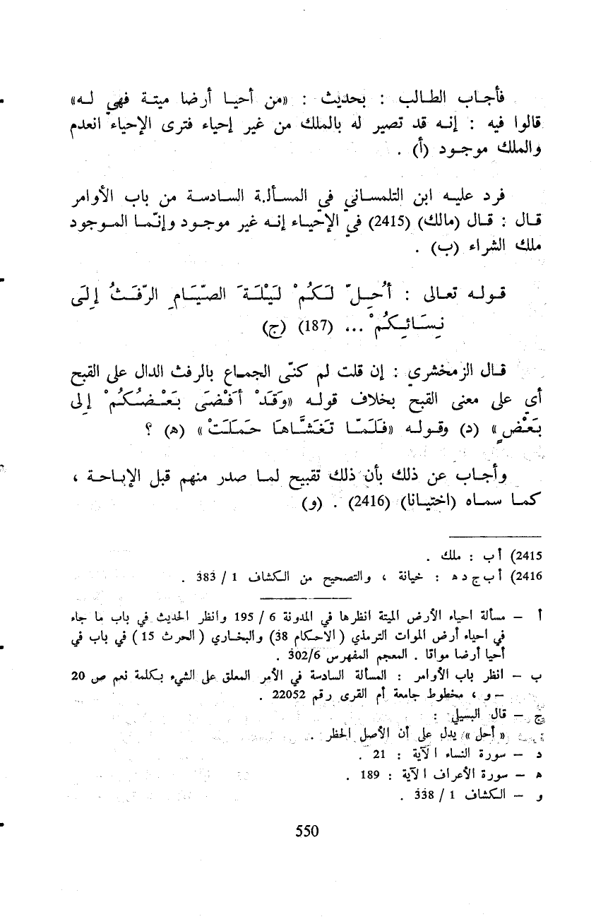 فرد عليه ابن التلمساني في المسألة السادسة من باب الأوامر قال: قال (مالك) في الإحياء إنه غير موجود وإنّما الموجود ملك الشراء.