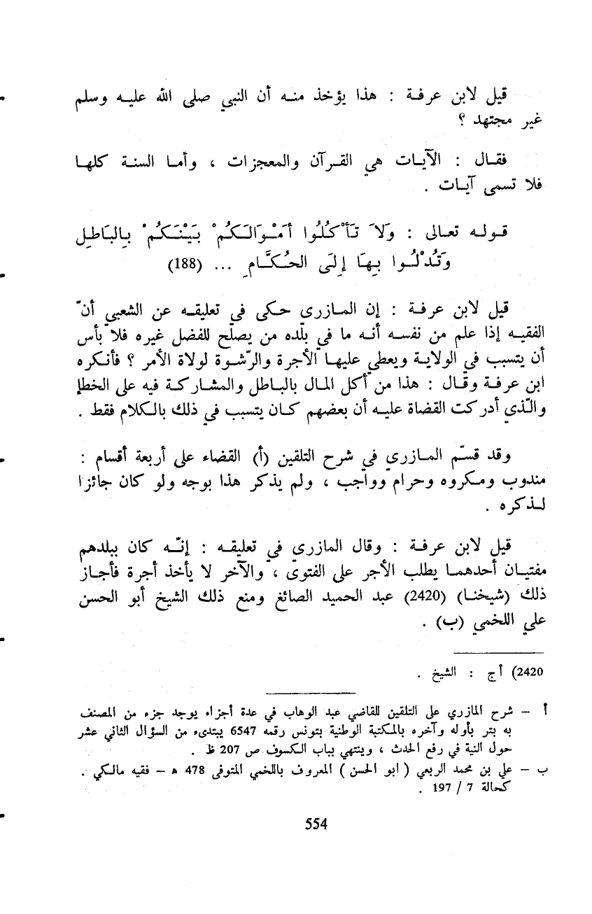 قيل لابن عرفة: وقال المازري في تعليقه: إنّه كان ببلدهم مفتيان أحدهما يطلب الأجر على الفتوى، والآخر لا يأخذ أجرة فأجاز ذلك (شيخنا) عبد الحميد الصائغ ومنع ذلك الشيخ أبو الحسن علي اللخمي.