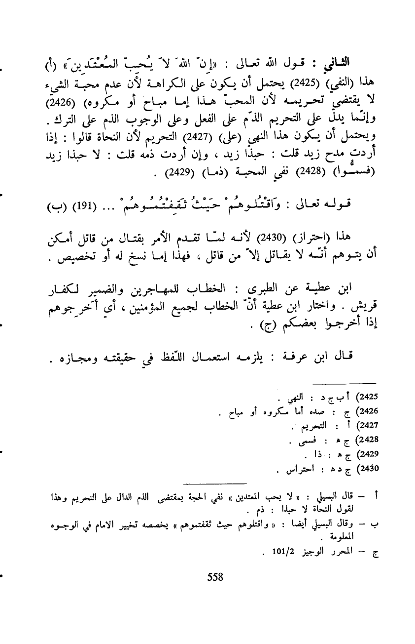 الثاني: قول الله تعالى: {إِنَّ الله لاَ يُحِبُّ المعتدين} هذا (النفي) يحتمل أن يكون على الكراهة لأن عدم محبة الشيء لا يقتضي تحريمه لأن المحبّ هذا إما مباح أو مكروه) وإنّما يدل على التحريم الذّم على الفعل وعلى الوجوب الذم على الترك. ويحتمل أن يكون هذا النهي (على) التحريم لأن النحاة قالوا: إذا أردت مدح زيد قلت: حبذا زيد، وإن أردت ذمه قلت: لا حبذا زيد (فسمُّوا) نفي المحبة (ذما) .