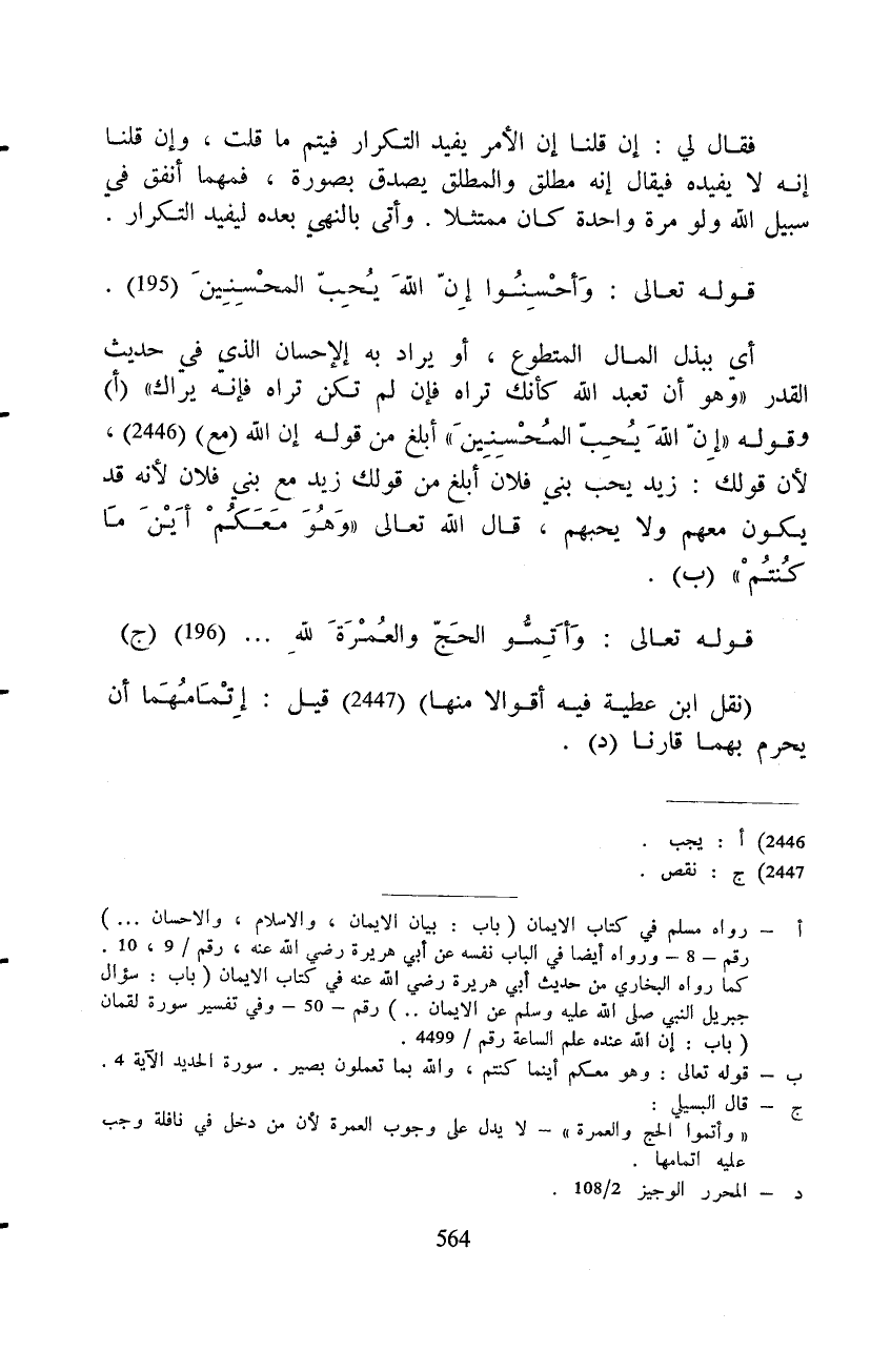 أي ببذل المال المتطوع، أو يراد به الإحسان الذي في حديث القدر «وهو أن تعبد الله كأنك تراه فإن لم تكن تراه فإنه يراك» وقوله {إِنَّ الله يُحِبُّ المحسنين} أبلغ من قوله إن الله (مع) ، لأن قولك: زيد يحب بني فلان أبلغ من قولك زيد مع بني فلان لأنه قد يكون معهم ولا يحبهم، قال الله تعالى {وَهُوَ مَعَكُمْ أَيْنَ مَا كُنتُمْ.}