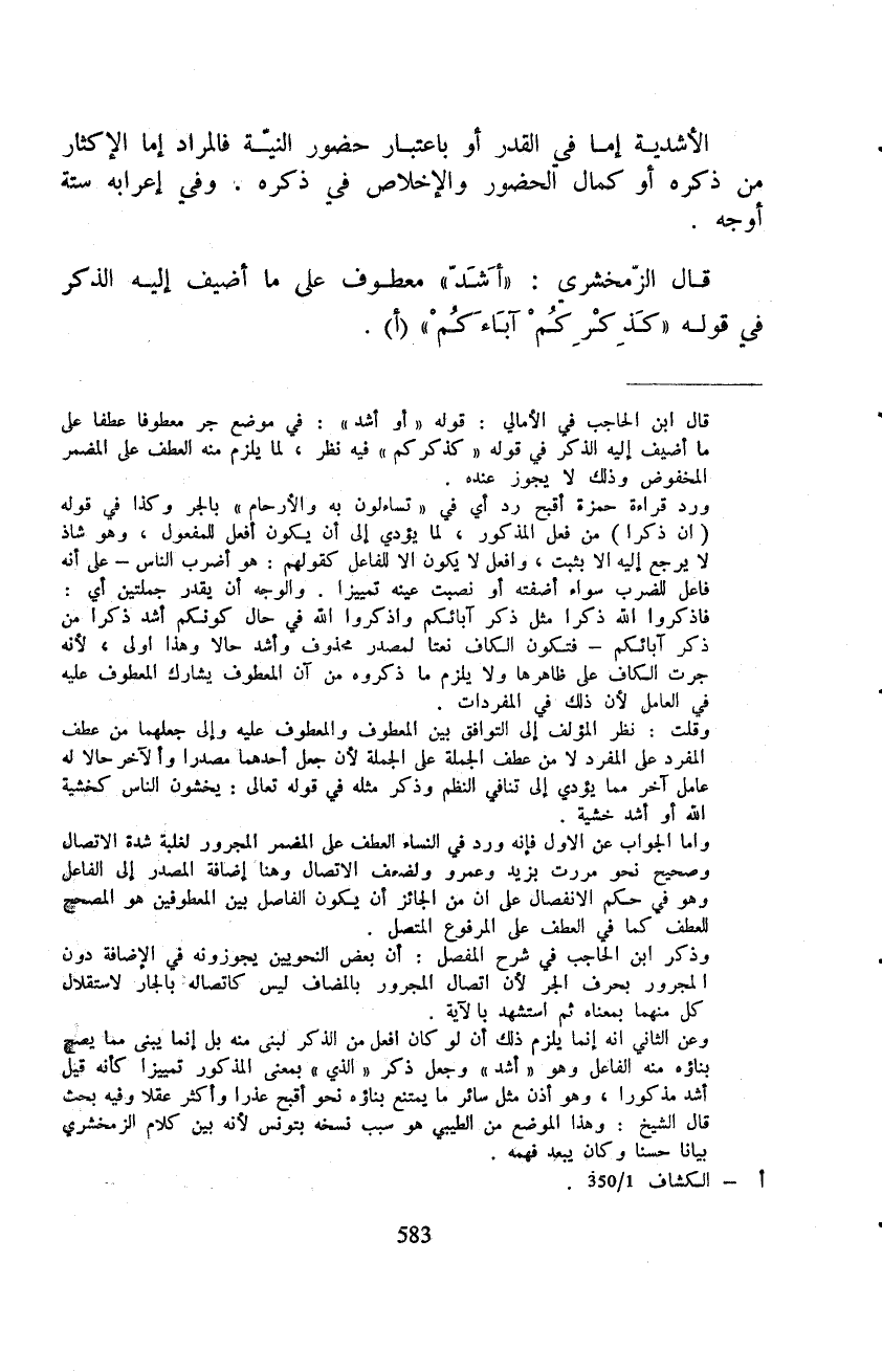 الأشدية إما في القدر أو باعتبار حضور النيّة فالمراد إما الإكثار من ذكره أو كمال الحضور والإخلاص في ذكره. وفي إعرابه ستة أوجه.