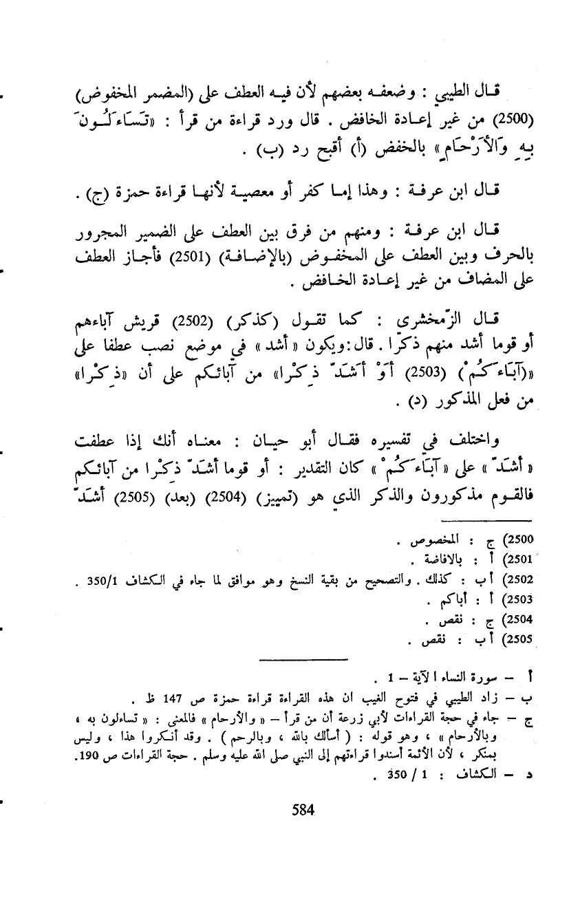 قال الطيبي: وضعفه بعضهم لأن فيه العطف على (المضمر المخفوض) من غير أعادة الخافض. قال ورد قراءة من قرأ {تَسَآءَلُونَ بِهِ والأرحام} بالخفض أقبح رد.
