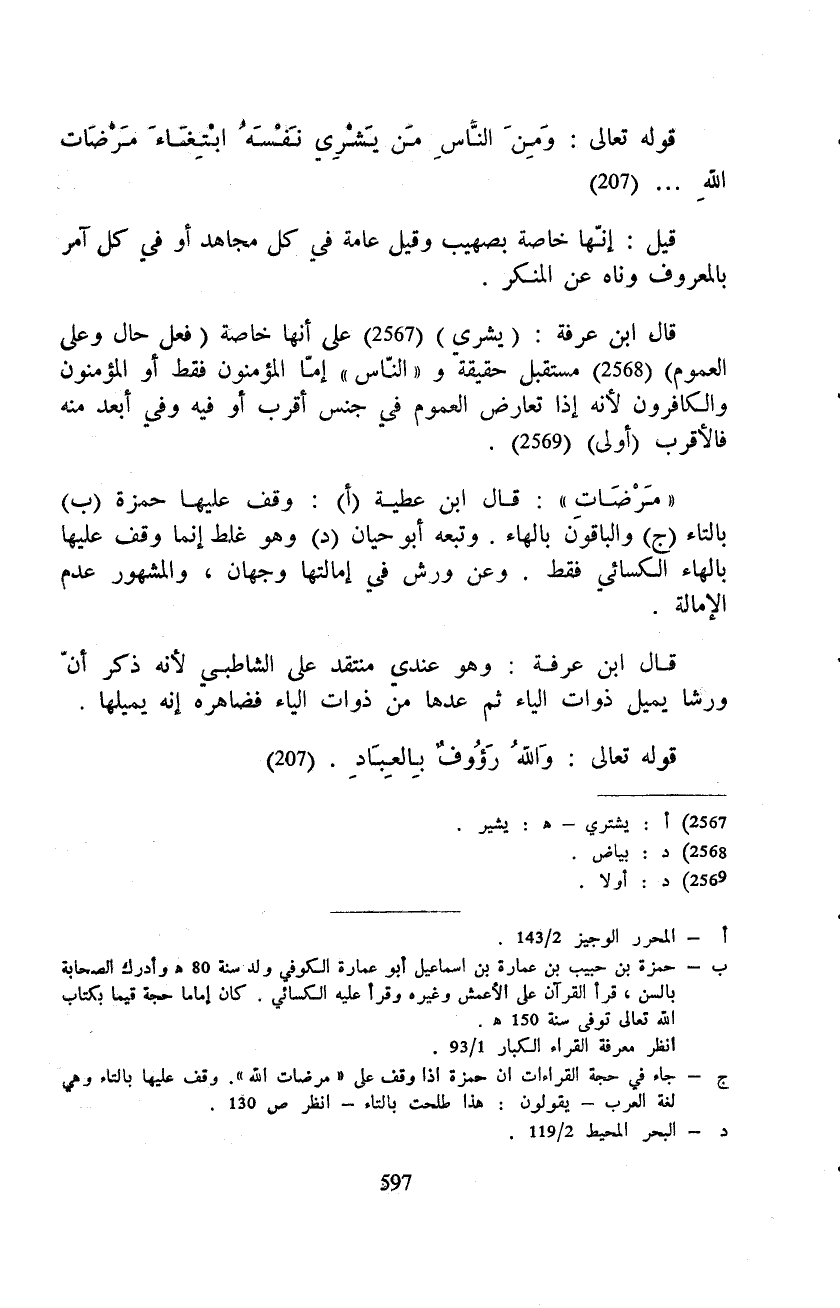 قال ابن عرفة: (يشري) على أنها خاصة (فعل حال وعلى العموم) مستقبل حقيقة و «النّاس» إمّا المؤمنون فقط أو المؤمنون والكافرون لأنه إذا تعارض العموم في جنس أقرب أو فيه وفي أبعد منه فالأقرب (أولى) .