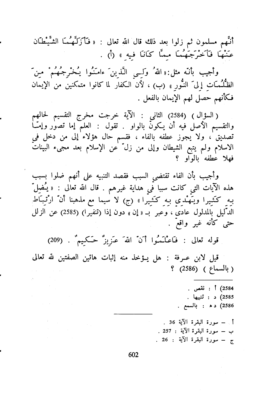 (السؤال) الثاني: الآية خرجت مخرج التقسيم لحالهم والتقسيم الأصل فيه أن يكون بالواو. تقول: العلم إما تصور وإمّا تصديق، ولا يجوز عطفه بالفاء، فقسم حال هؤلاء إلى من دخل في الاسلام ولم يتبع الشيطان وإلى من زلّ عن الإسلام بعد مجىء البينات فهلا عطفه بالواو؟