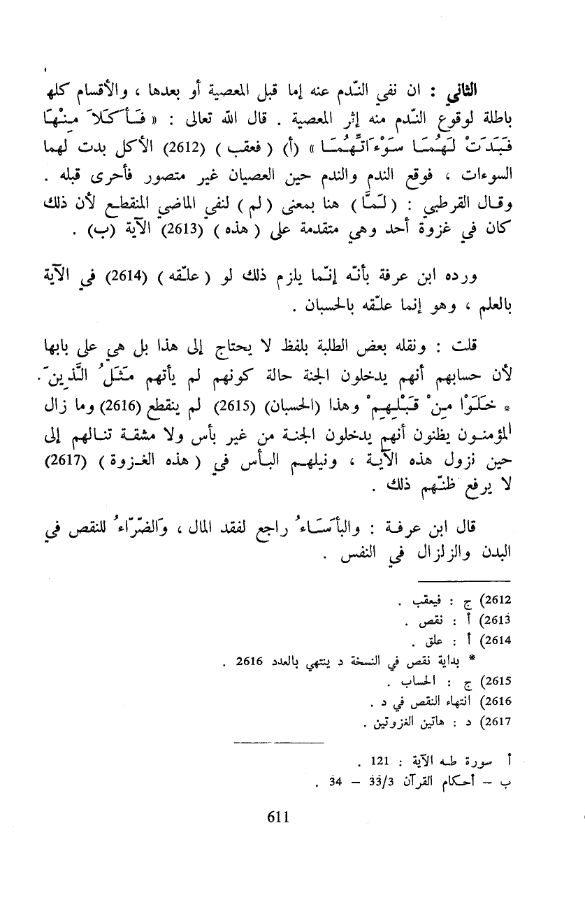 الثاني: ان نفي النّدم عنه إما قبل المعصية أو بعدها، والأقسام كلها باطلة لوقوع النّدم منه إثر المعصية. قال الله تعالى {فَأَكَلاَ مِنْهَا فَبَدَتْ لَهُمَا سَوْءَاتُهُمَا} (فعقب) الأكل بدت لهما السوءات، فوقع الندم والندم حين العصيان غير متصور فأحرى قبله.