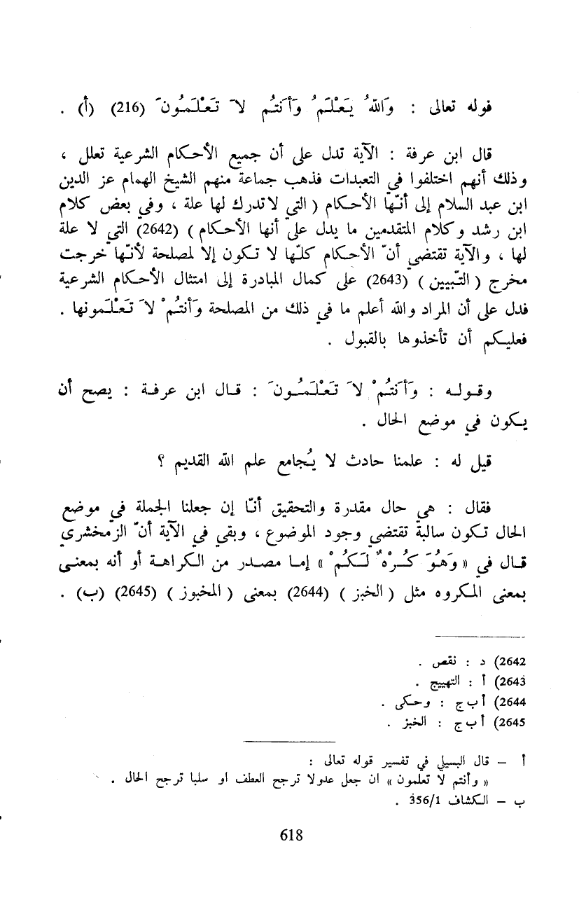 قال ابن عرفة: الآية تدل على أن جميع الأحكام الشرعية تعلل، وذلك أنهم اختلفوا في التعبدات فذهب جماعة منهم الشيخ الهمام عز الدين ابن عبد السلام إلى أنّها الأحكام (التي لاتدرك لها علة، وفي بعض كلام ابن رشد وكلام المتقدمين ما يدل على أنها الأحكام) التي لا علة لها، والآية تقتضي أنّ الأحكام كلّها لاتكون إلا لمصلحة لأنّها خرجت مخرج (التّبيين) على كمال المبادرة إلى امتثال الأحكام الشرعية فدل على أن المراد والله أعلم ما في ذلك من المصلحة وَأنتُمْ لاَ تَعْلَمونها.