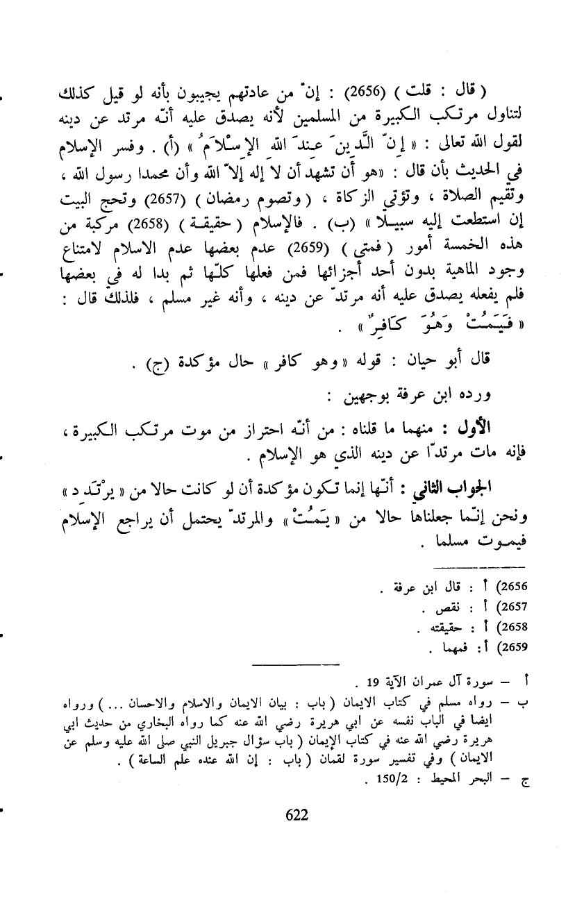 (قال: قلت) : إنّ من عادتهم يجيبون بأنه لو قيل كذلك لتناول مرتكب الكبيرة من المسلمين لأنه يصدق عليه أنّه مرتد عن دينه لقوله تعالى: