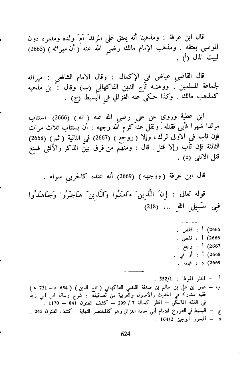 قال ابن عرفة: ومذهبنا أنه يعتق على المرتدّ أمّ ولده ومدبره دون الموصى بعتقه. ومذهب الإمام مالك رَضِيَ اللَّهُ عَنْه (أن ميراثه) لبيت المال.