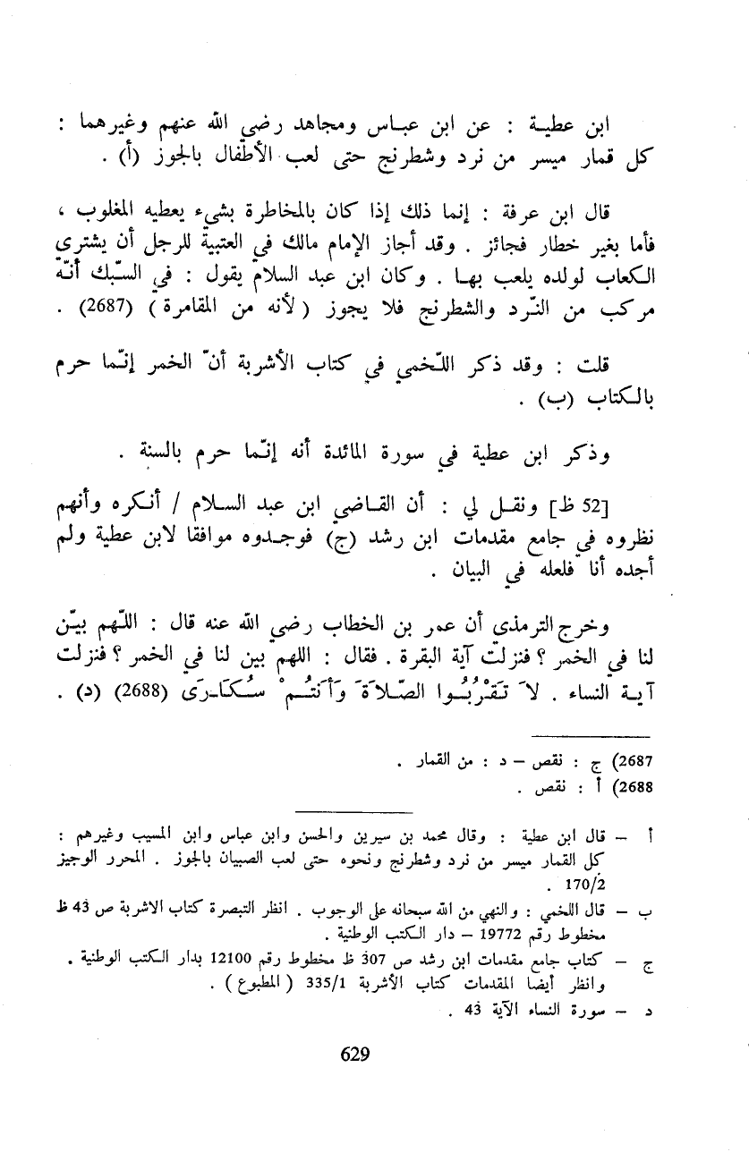 ابن عطية: عن ابن عباس ومجاهد رَضِيَ اللَّهُ عَنْهم وغيرهما: كل قمار ميسر من نرد وشطرنج حتى لعب الأطفال بالجوز.