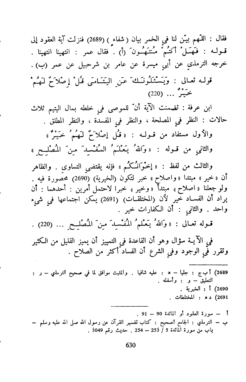 فقال: اللهم بيّن لنا في الخمر بيان (شفاءٍ) فنزلت آية العقود إلى قوله: فَهَلْ أَنْتُمْ مُّنتَهُونَ. فقال عمر: انتهينا انتهينا. خرجه الترمذي عن أبي ميسرة عن عامر بن شرحبيل عن عمر (ب) .