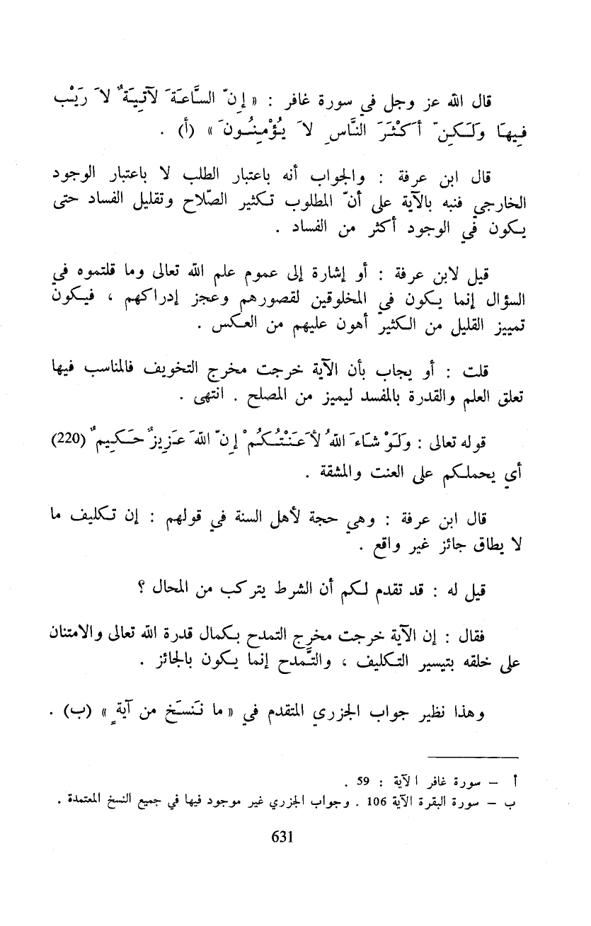 قال الله عَزَّ وَجَلَّ في سورة غافر: {إِنَّ الساعة لأَتِيَةٌ لاَّ رَيْبَ فِيهَا ولكن أَكْثَرَ الناس لاَ يُؤْمِنُونَ} قال ابن عرفة: والجواب أنه باعتبار الطلب لا باعتبار الوجود الخارجي فنبه بالآية على أنّ المطلوب تكثير الصّلاح وتقليل الفساد حتى يكون في الوجود أكثر من الفساد.