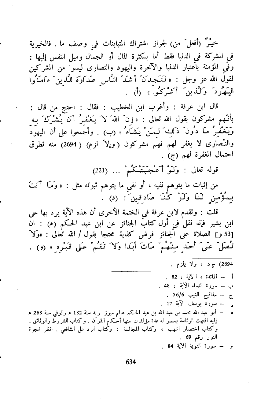 وفي المؤمنة باعتبار الدنيا والأخرة واليهود والنصارى ليسوا من المشركين لقول الله عَزَّ وَجَلَّ: {لَتَجِدَنَّ أَشَدَّ الناس عَدَاوَةً لِّلَّذِينَ آمَنُواْ اليهود والذين أَشْرَكُواْ} قال ابن عرفة: وأغرب ابن الخطيب: فقال: احتج من قال: بأنّهم مشركون بقول الله تعالى: {إِنَّ الله لاَ يَغْفِرُ أَن يُشْرَكَ بِهِ وَيَغْفِرُ مَا دُونَ ذَلِكَ لِمَن يَشَآءُ} وأجمعوا على أن اليهود والنّصارى لا يغفر لهم فهم مشركون (وإلاّ لزم) منه تطرق احتمال المغفرة لهم.