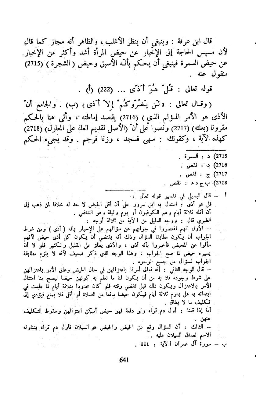 قال ابن عرفة: وينبغي أن ينظر الأغلب، والظاهر أنه مجاز كما قال لأن مسيس الحاجة إلى الإخبار عن حيض المرأة أشد وأكثر من الإخبار عن حيض السمرة فينبغي أن يحكم بأنّه الأسبق وحيض (الشجرة) منقول عنه.