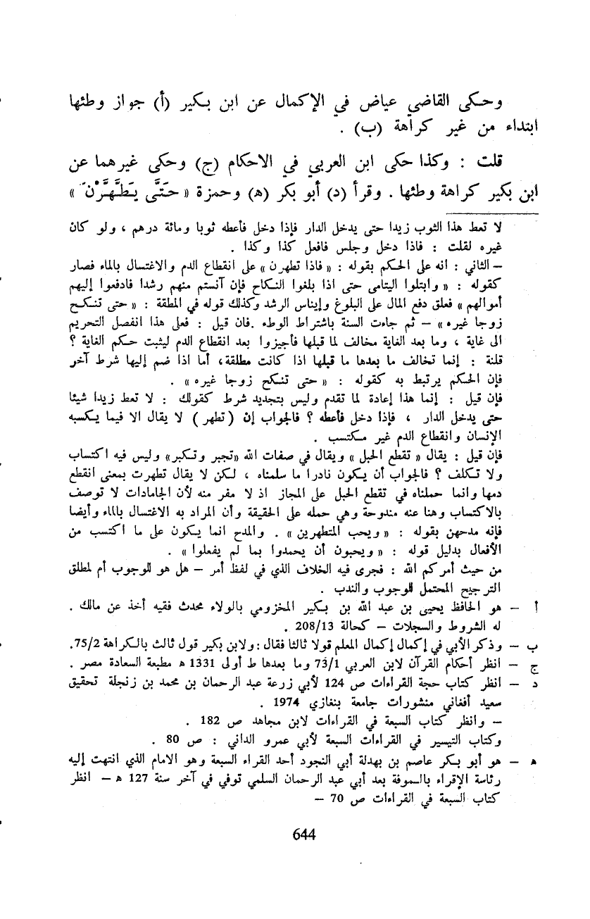 قلت: وكذا حكى ابن العربي في الاحكام وحكى غيرهما عن ابن بكير كراهة وطئها. وقرأ أبو بكر وحمزة «حتى يَطْهُرْنَ»