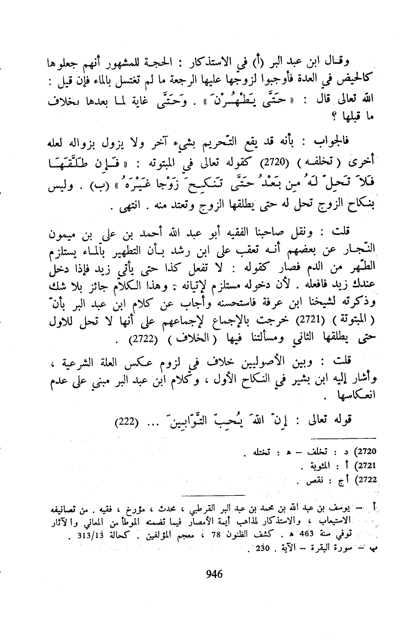 قلت: ونقل صاحبنا الفقيه أبو عبد الله أحمد بن علي بن ميمون النّجار عن بعضهم أنه تعقب على ابن رشد بأن التطهير بالماء يستلزم الطّهر من الدم فصار كقوله: لا تفعل كذا حتى يأتي زيد فإذا دخل عندك زيد فافعله. لأن دخوله مستلزم لإتيانه. وهذا الكلام جائز بلا شك وذكرته لشيخنا ابن عرفة فاستحسنه وأجاب عن كلام ابن عبد البر بأنّ (المبتوتة) خرجت بالإجماع لإجماعهم على أنها لا تحل للاول حتى يطلقها الثاني ومسألتنا فيها (الخلاف) .
