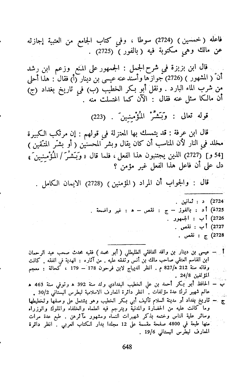 قال ابن عرفة: قد يتمسك بها المعتزلة في قولهم: إن مرتكب الكبيرة مخلد في النار لأن المناسب أن كان يقال وبشر المحسنين (أو بشّر المتّقين) الذين يجتنبون هذا الفعل، فما قال «وَبَشِّرَ / المُؤْمِنِينَ» دل على أن فاعل هذا الفعل غير مؤمن؟