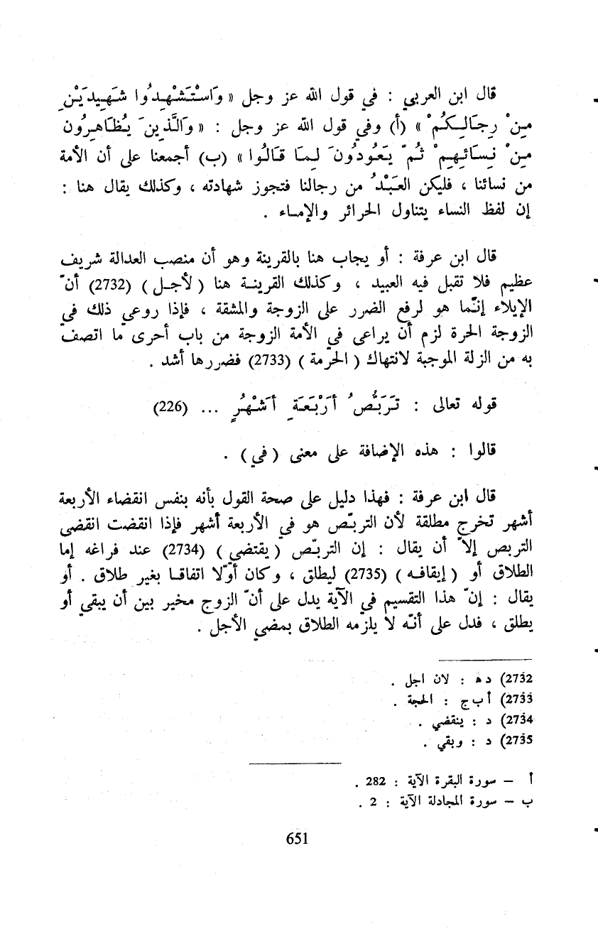 قال ابن عرفة: فهذا دليل على صحة القول بأنه بنفس انقضاء الأربعة أشهر تخرج مطلقة لأن التربّص هو في الأربعة أشهر فإذا انقضت انقضى التربص إلاّ أن يقال: إن التربّص (يقتضي) عند فراغه إما الطلاق أو (أيقافه) ليطلق، وكان أوّلا اتفاقا بغير طلاق. أو يقال: إنّ هذا التقسيم في الآية يدل على أنّ الزوج مخير بين أن يبقي أو يطلق، فدل على أنّه لا يلزمه الطلاق بمضي الأجل.