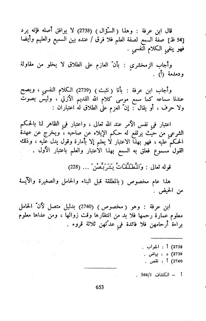وأجاب ابن عرفة: بأنا (نثبت) الكلام النفسي، ويصح عندنا سماعه كما سمع موسى كلام الله القديم الأزلي، وليس بصوت ولا حرف، أو يقال: إنّ العزم على الطلاق له اعتباران:
