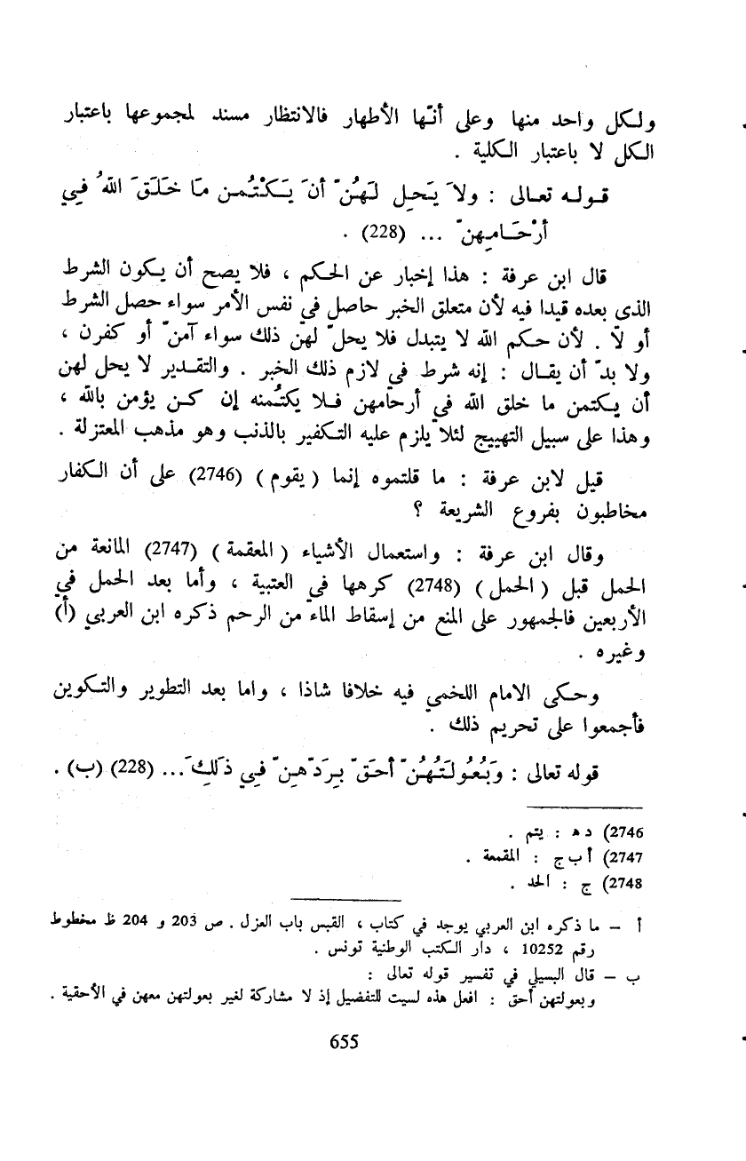 قال ابن عرفة: هذا إخبار عن الحكم، فلا يصح أن يكون الشرط الذي بعده قيدا فيه لأن متعلق الخبر حاصل في نفس الأمر سواء حصل الشرط أو لا. لأن حكم الله لا يتبدل فلا يحل لهن ذلك سواء آمنّ أو كفرن، ولا بدّ أن يقال: إنه شرط في لازم ذلك الخبر. والتقدير لا يحل لهن أن يكتمن ما خلق الله في أرحامهن فلا يكتُمنه إن كن يؤمن بالله، وهذا على سبيل التهييج لئلا يلزم عليه التكفير بالذنب وهو مذهب المعتزلة.
