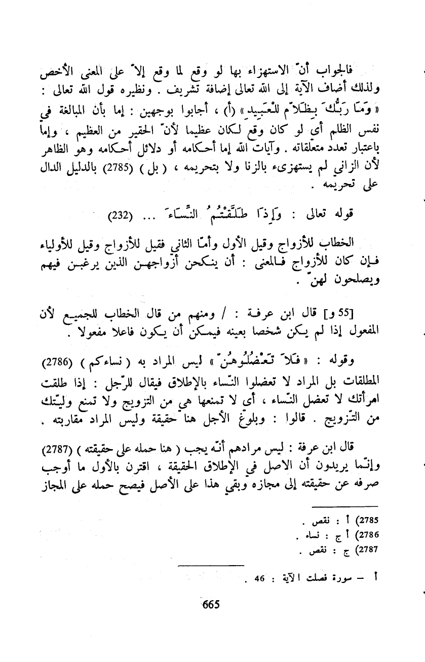 قال ابن عرفة: ليس مرادهم أنّه يجب (هنا حمله على حقيقته) وإنّما يريدون أن الاصل في الإطلاق الحقيقة، اقترن بالأول ما أوجب صرفه عن حقيقته إلى مجازه وبقي هذا على الأصل فيصح حمله على المجاز