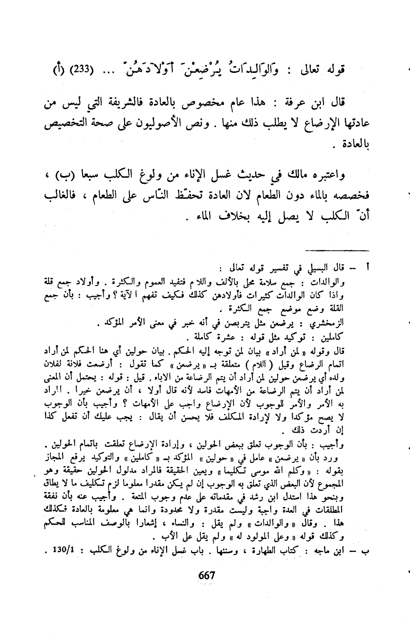 قال ابن عرفة: هذا عام مخصوص بالعادة فالشريفة التي ليس من عادتها الإرضاع لا يطلب ذلك منها. ونص الأصوليون على صحة التخصيص بالعادة.