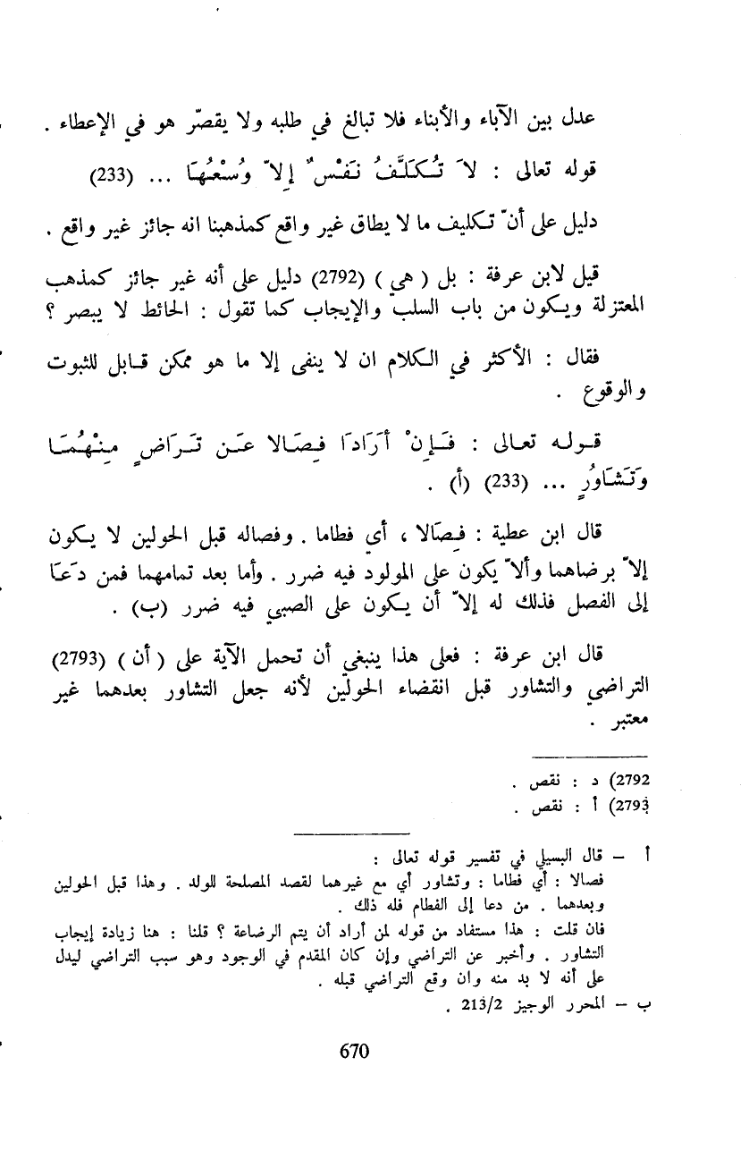 قال ابن عرفة: فعلى هذا ينبغي أن تحمل الآية على (أن) التراضي والتشاور قبل انقضاء الحولين لأنه جعل التشاور بعدهما غير معتبر.