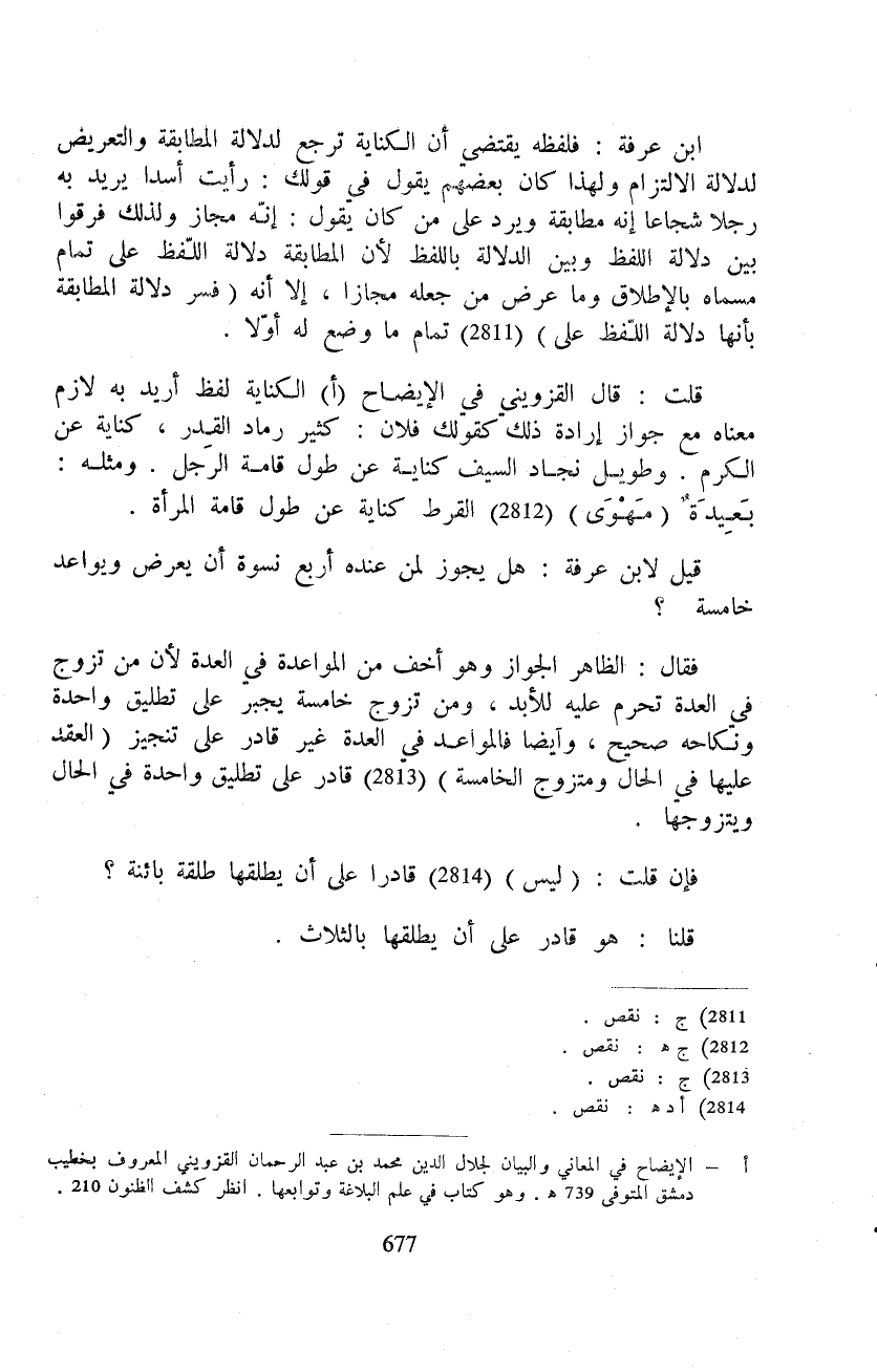 ابن عرفة: فلفظه يقتضي أن الكناية ترجع لدلالة المطابقة والتعريض لدلالة الالتزام ولهذا كان بعضهم يقول في قولك: رأيت أسدا يريد به رجلا شجاعا إنه مطابقة ويرد على من كان يقول: إنّه مجاز ولذلك فرقوا بين دلالة اللفظ وبين الدلالة باللفظ لأن المطابقة دلالة اللّفظ على تمام مسماه بالإطلاق وما عرض من جعله مجازا، إلا أنه (فسر دلالة المطابقة بأنها دلالة اللّفظ على) تمام ما وضع له أوّلا.