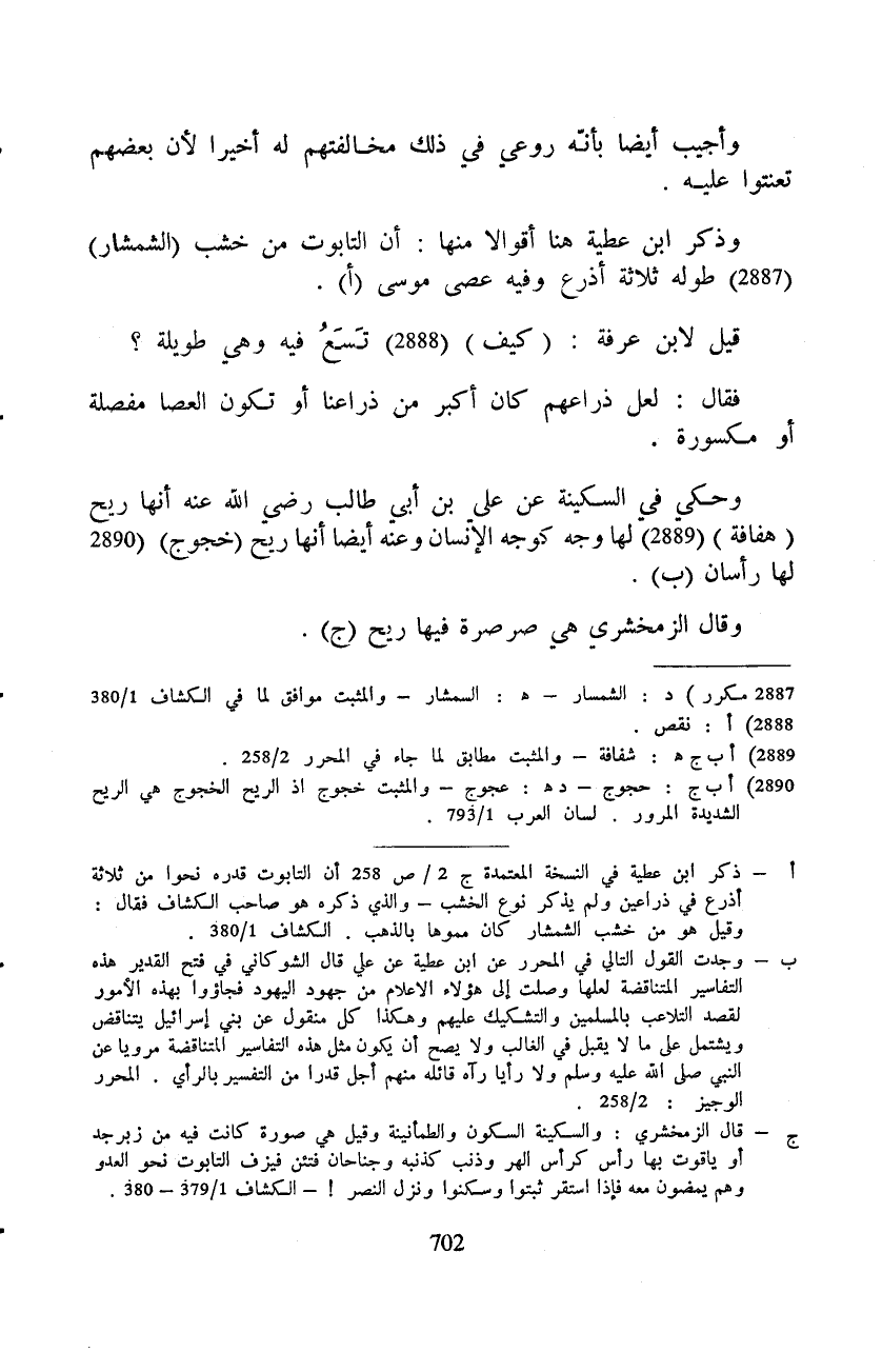 وحكي في السكينة عن علي بن أبي طالب رَضِيَ اللَّهُ عَنْه أنها ريح (هفافة) لها وجه كوجه الإنسان وعنه أيضا أنها ريح (خجوج) لها رأسان.