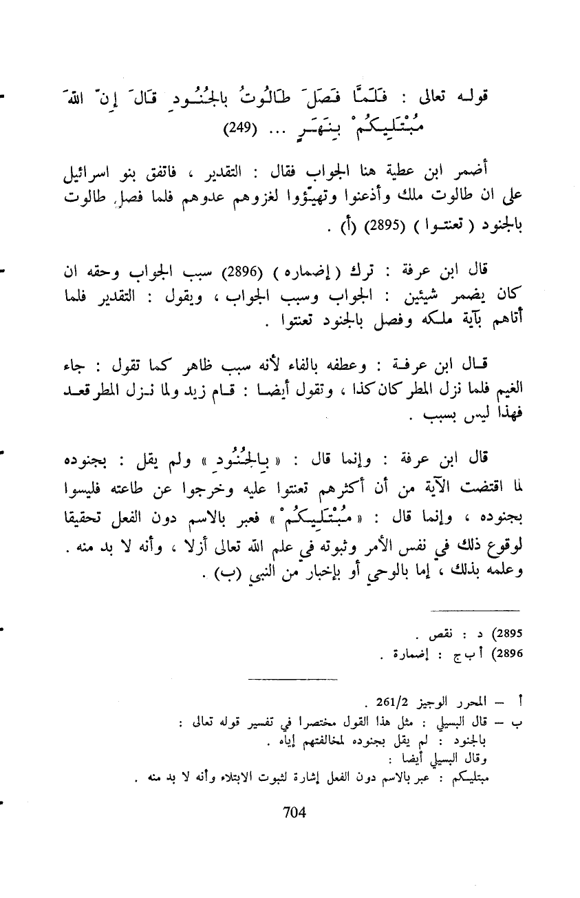 قال ابن عرفة: وإنما قال: «بِالجُنُودِ» ولم يقل: بجنوده لما اقتضت الآية من أن أكثرهم تعنتوا عليه وخرجوا عن طاعته فليسوا بجنوده، وإنما قال: «مُبْتَلِيكُمْ» فعبر بالاسم دون الفعل تحقيقا لوقوع ذلك في نفس الأمر وثبوته في علم الله تعالى أزلا، وأنه لا بد منه.