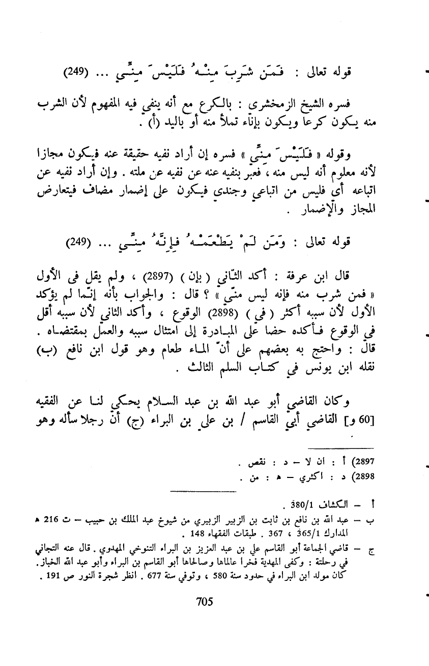 قال ابن عرفة: أكد الثّاني (بإن) ، ولم يقل في الأول «فمن شرب منه فإنه ليس منّي» ؟ قال: والجواب بأنه إنّما لم يؤكد الأول لأن سببه أكثر (في) الوقوع، وأكد الثاني لأن سببه أقل في الوقوع فأكده حضا على المبادرة إلى امتثال سببه والعمل بمقتضاه.