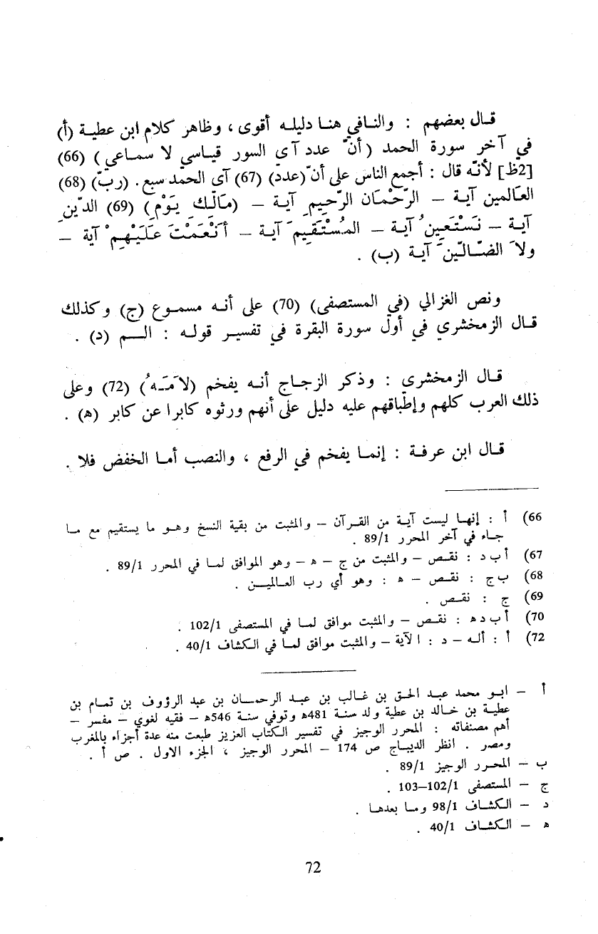 قال بعضهم: والنافي هنا دليله أقوى، وظاهر كلام ابن عطية في آخر سورة الحمد (أنّ عدد آي السور قياسي لا سماعي) لأنّه قال: أجمع الناس على أنّ (عدد) آي الحمد سبع. (ربّ) العَالمين آية - الرّحْمَان الرحِيمِ آية - (مَالِكِ يَوْمِ) الدّينِ آية - نَسْتَعينُ آية - أَنْعَمْتَ عَلَيْهِمْ آية - وَلاَ الضّالّينَ آية.