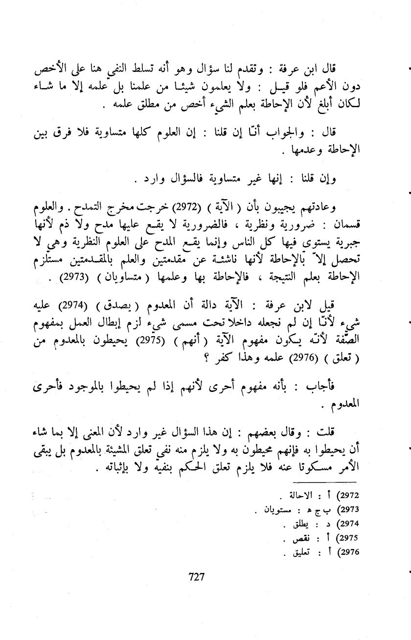 وعادتهم يجيبون بأن (الآية) خرجت مخرج التمدح. والعلوم قسمان: ضرورية ونظرية، فالضرورية لا يقع عليها مدح ولا ذم لأنها جبرية يستوي فيها كل الناس وإنما يقع المدح على العلوم النظرية وهي لا تحصل إلاّ بالإحاطة لأنها ناشئة عن مقدمتين والعلم بالمقدمتين مستلزم الإحاطة بعلم النتيجة، فالإحاطة بها وعلمها (متساويان) .