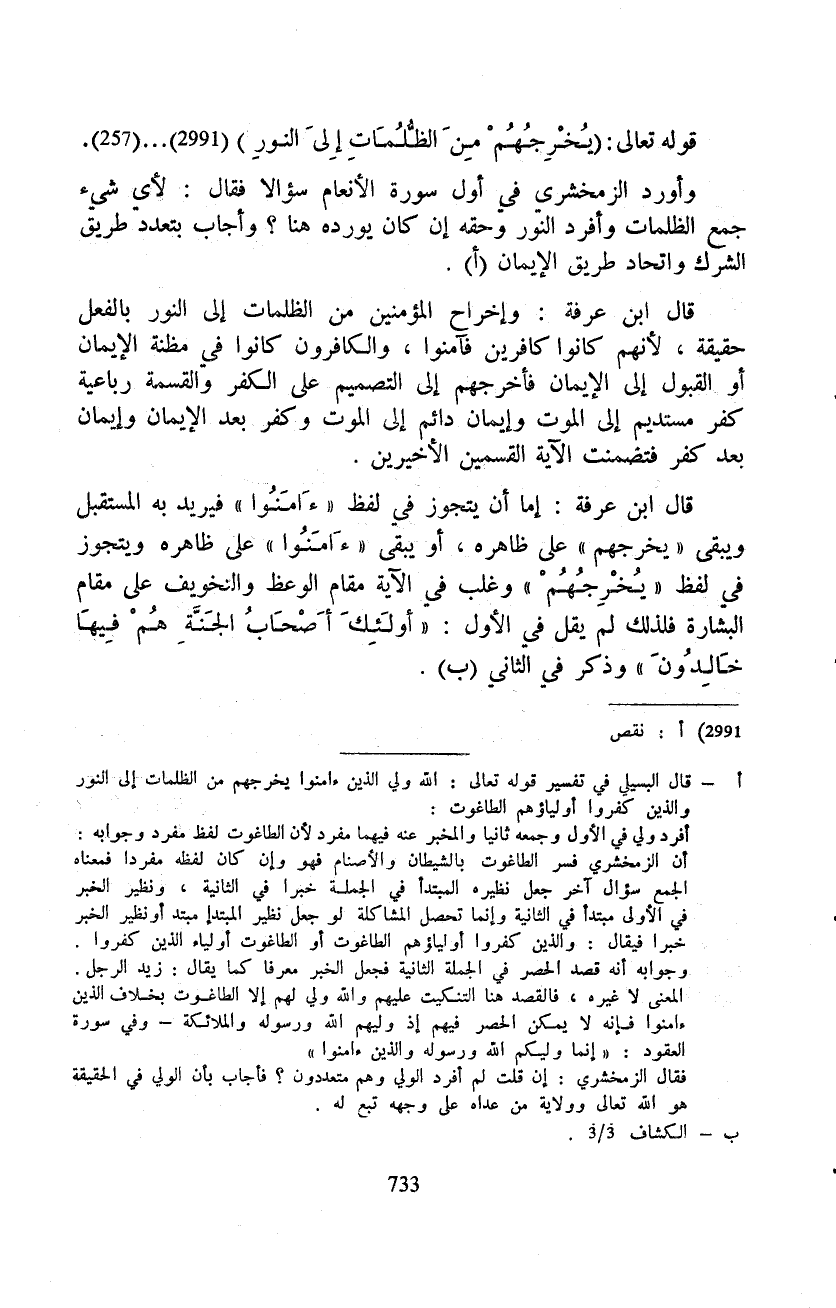 قال ابن عرفة: وإخراج المؤمنين من الظلمات إلى النور بالفعل حقيقة، لأنهم كانوا كافرين فآمنوا، والكافرون كانوا في مظنة الإيمان أو القبول إلى الإيمان فأخرجهم إلى التصميم على الكفر والقسمة رباعية كفر مستديم إلى الموت وإيمان دائم إلى الموت وكفر بعد الإيمان وإيمان بعد كفر فتضمنت الآية القسمين الأخيرين.