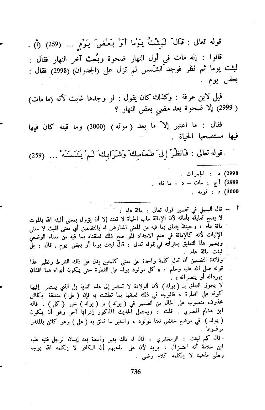 قالوا: إنه مات في أول النهار ضحوة وبُعث آخر النهار فقال: لبثت يوما ثم نظر فوجد الشّمس لم تزل على (الجدران) فقال: بعض يوم.