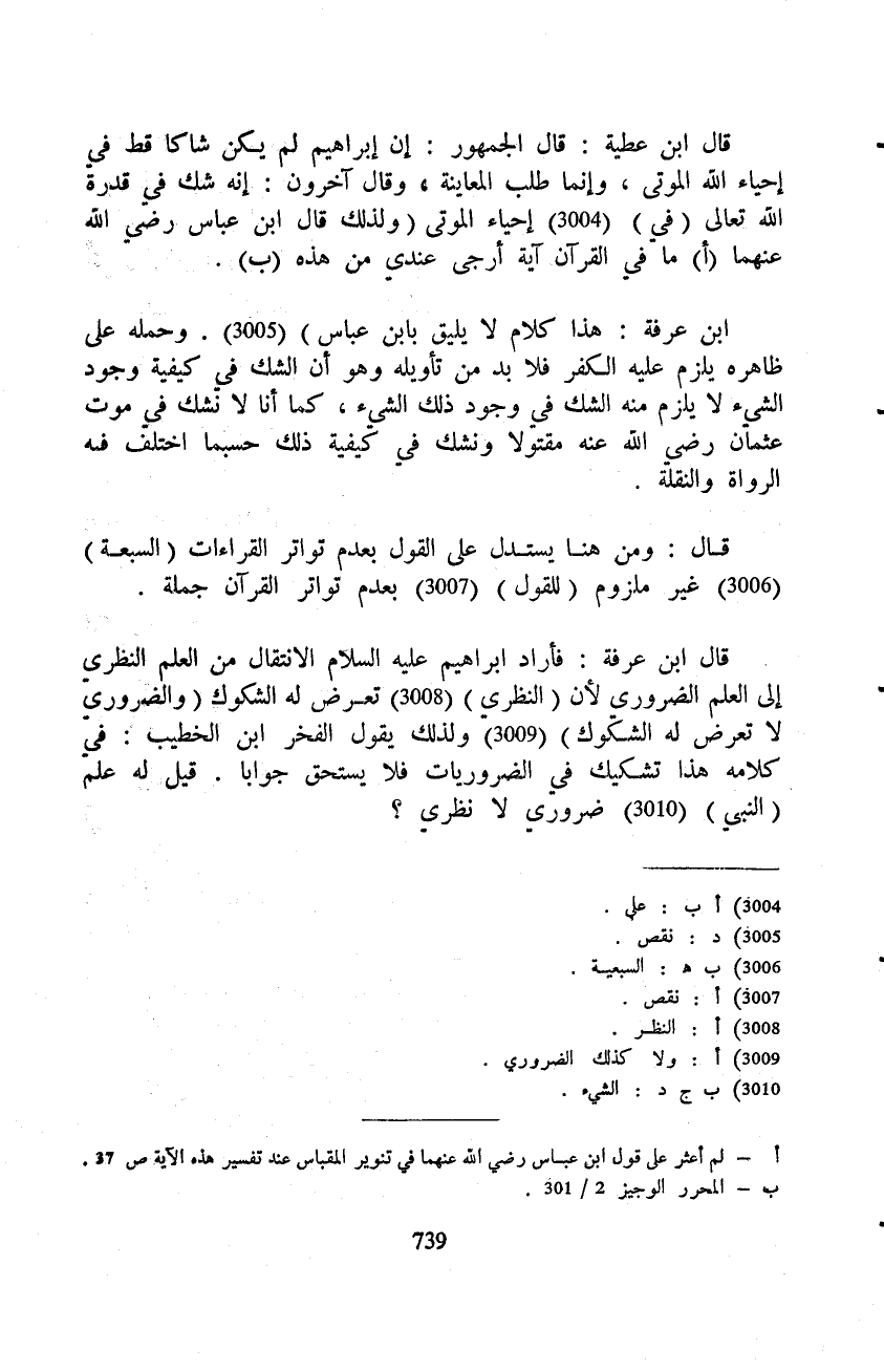 قال ابن عرفة: فأراد ابراهيم عليه السلام الانتقال من العلم النظري إلى العلم الضروري لأن (النظري) تعرض له الشكوك (والضروري لا تعرض له الشكوك) ولذلك يقول الفخر ابن الخطيب: في كلامه هذا تشكيك في الضروريات فلا يستحق جوابا. قيل له علم (النبي) ضروري لا نظري؟