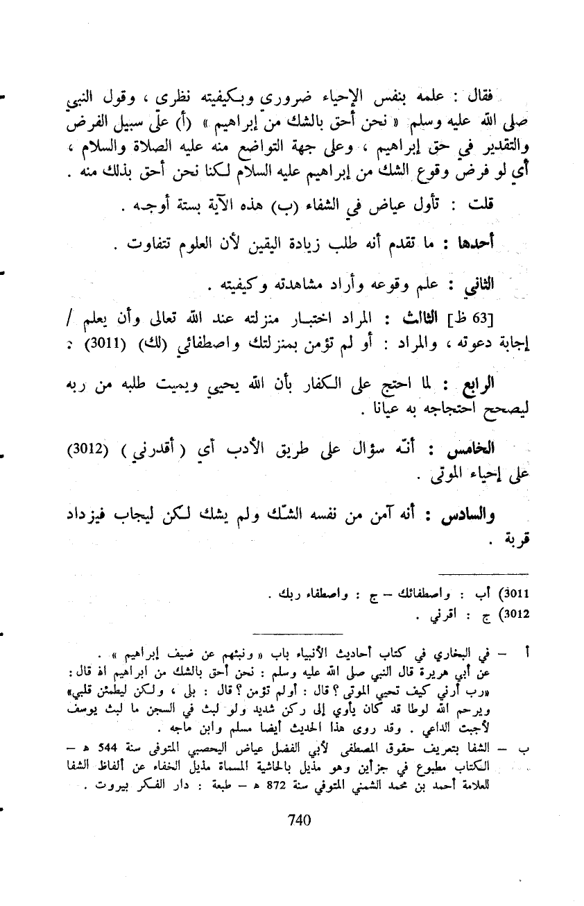 فقال: علمه بنفس الإحياء ضروري وبكيفيته نظري، وقول النبي صَلَّى اللَّهُ عَلَيْهِ وَسَلَّم َ «نحن أحق بالشك من إبراهيم» على سبيل الفرض والتقدير في حق إبراهيم، وعلى جهة التواضع منه عَلَيْهِ الصَّلَاة وَالسَّلَام ُ، أي لو فرض وقوع الشك من إبراهيم عليه السلام لكنا نحن أحق بذلك منه.
