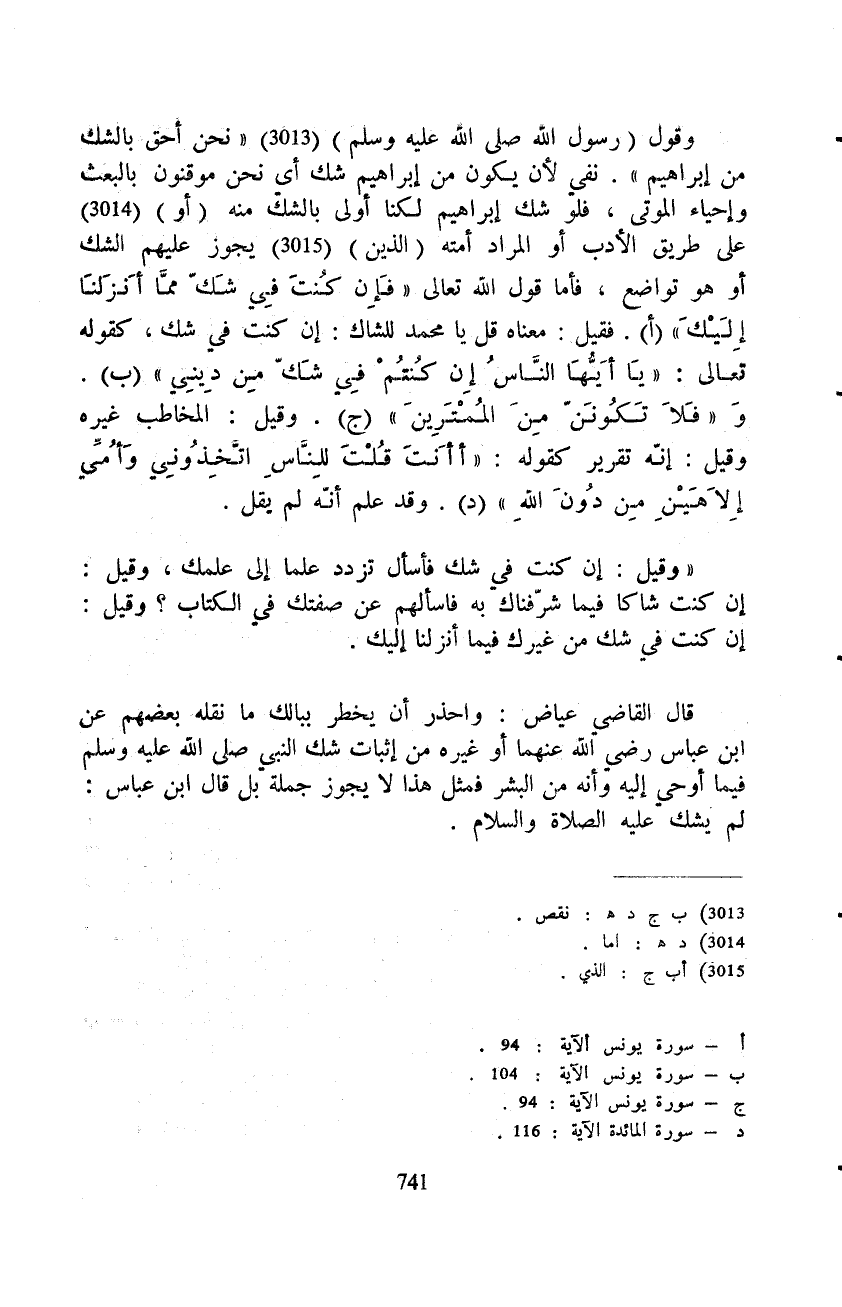 قال القاضي عياض: واحذر أن يخطر ببالك ما نقله بعضهم عن ابن عباس رَضِيَ اللَّهُ عَنْهما أو غيره من إثبات شك النبي صَلَّى اللَّهُ عَلَيْهِ وَسَلَّم َ فيما أوحي إليه وأنه من البشر فمثل هذا لايجوز جملة بل قال ابن عباس: لم يشك عَلَيْهِ الصَّلَاة وَالسَّلَام ُ.