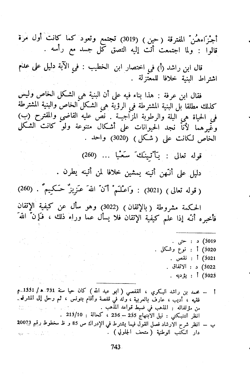فقال ابن عرفة: هذا بناء فيه على أن البنية هي الشكل الخاص وليس كذلك مطلقا بل البنية المشترطة في الرؤية هي الشكل الخاص والبنية المشترطة في الحياة هي البلة والرطوبة المزاجية. نص عليه القاضي والمقترح وغيرهما لأنا نجد الحيوانات على أشكال متنوعة ولو كانت الشكل الخاص لكانت على (شكل) واحد.
