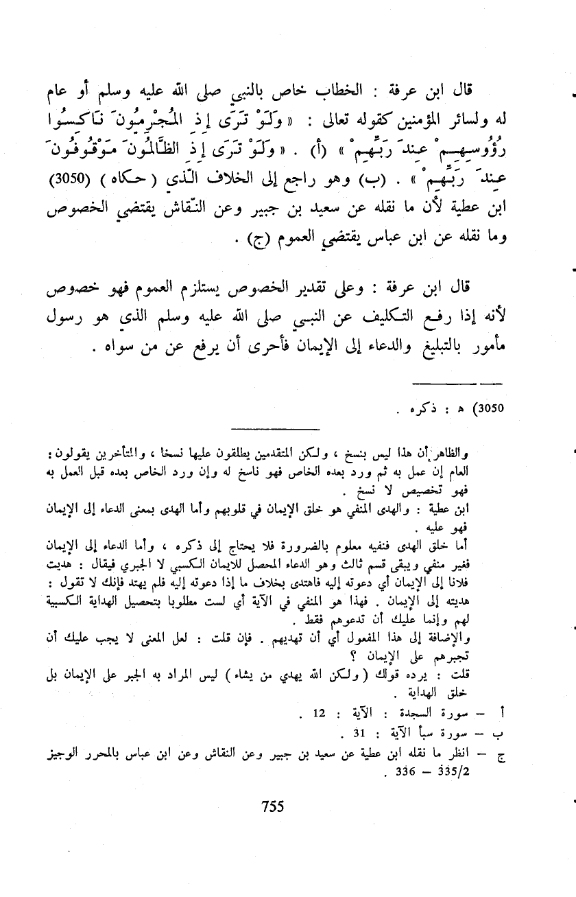 قال ابن عرفة: وعلى تقدير الخصوص يستلزم العموم فهو خصوص لأنه إذا رفع التكليف عن النبي صَلَّى اللَّهُ عَلَيْهِ وَسَلَّم َ الذي هو رسول مأمور بالتبليغ والدعاء إلى الإيمان فأحرى أن يرفع عن من سواه.