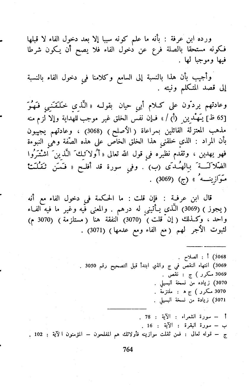 {أولئك الذين اشتروا الضلالة بالهدى} وفي سورة قد أفلح {فَمَن ثَقُلَتْ مَوَازِينُهُ} قال ابن عرفة: فإن قلت: ما الحكمة في دخول الفاء مع أنه (يجوز) الَّذي يأتيني له درهم. والمعنى فيه وغير ما فيه الفاء واحد، وكذلك (إن قلت) النفقة هنا (مستلزمة) لثبوت الأجر لهم (مع الفاء ومع عدمها) .